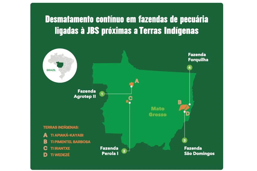 “Ao não agir, a JBS permitiu a destruição, que poderia ter sido evitada, de mais de 18 mil hectares na Amazônia e no Cerrado, em fazendas ligadas às suas extensas operações de carne bovina”, destacou João Gonçalves, diretor sênior da Mighty Earth no Brasil. “Nossa pesquisa mostra que a JBS continua a destruir a natureza para o gado com impunidade, ameaçando as comunidades indígenas, causando um aumento na grilagem de terras e aumentando a poluição climática”.